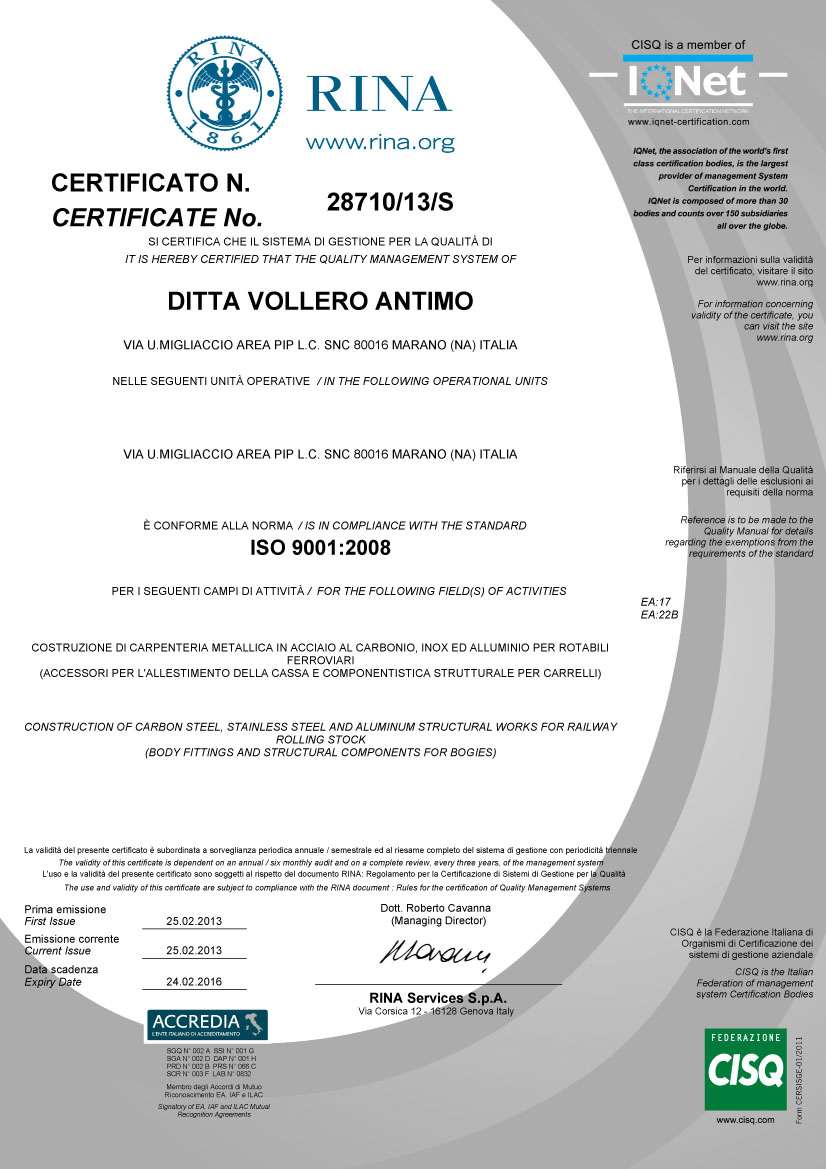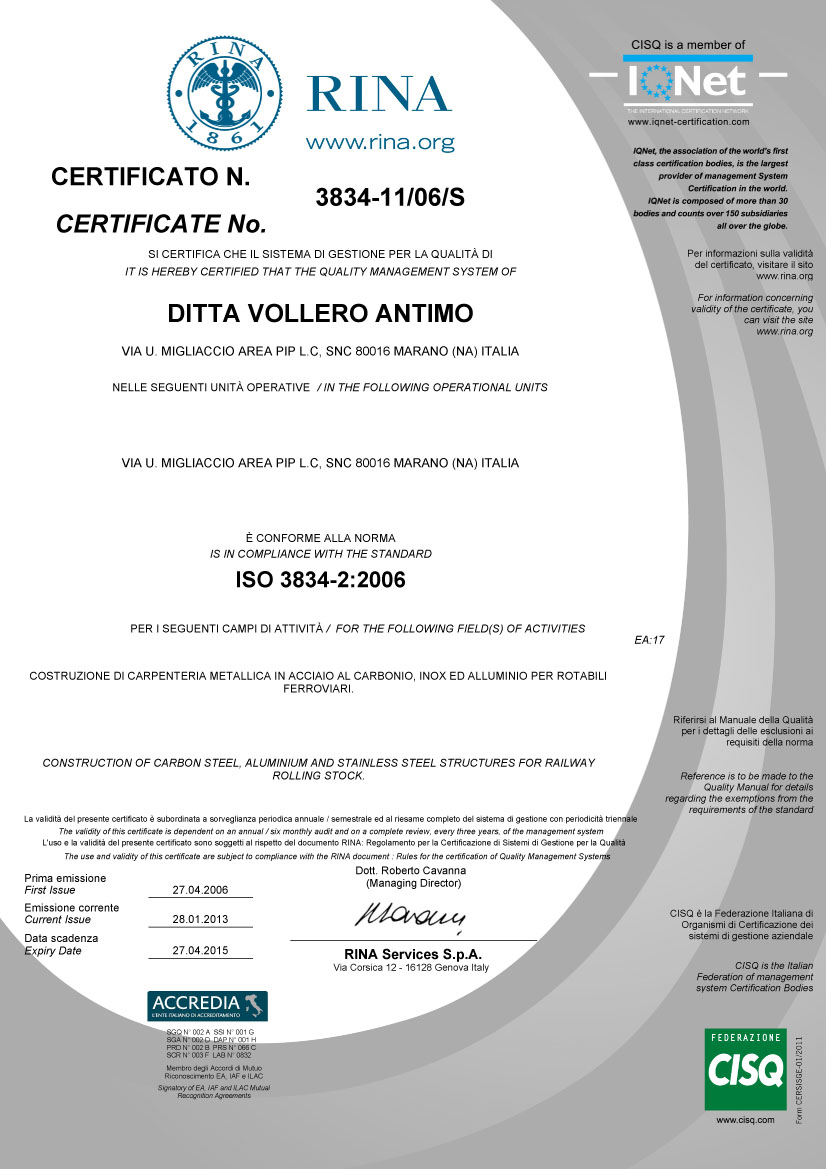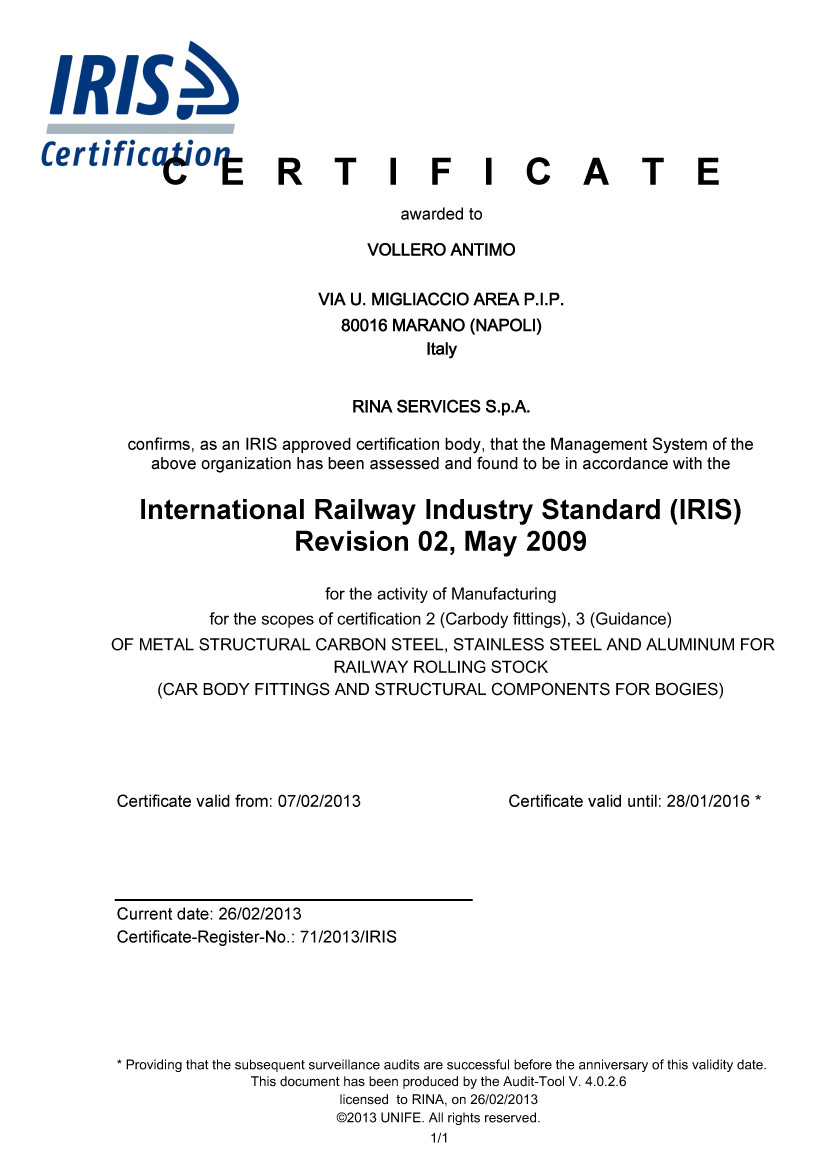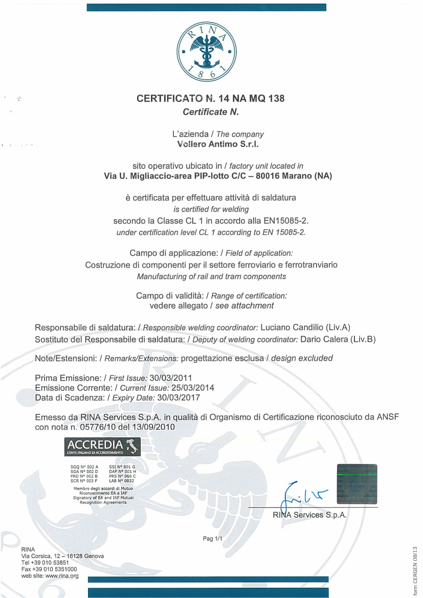 In 2005, the company obtained certification for welding management dealing with EN 729 , later become EN 3834, and at a later step, with a path of continuous improvement, in 2011 has been certified for the specific rail industry UNI EN 15085 CL1, that has helped to strengthen its market position.