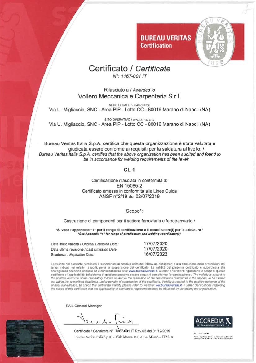 Nell’ 2011,poi, nell’ottica di una crescita in continua evoluzione,ha conseguito la certificazione specifica per il settore ferroviario UNI EN 15085 CL1 che ha contribuito a rafforzare la sua posizione sul mercato.