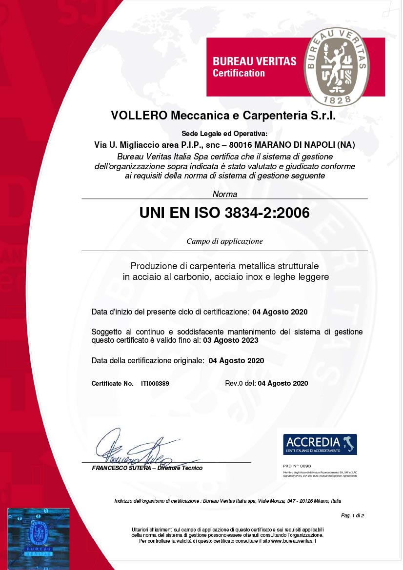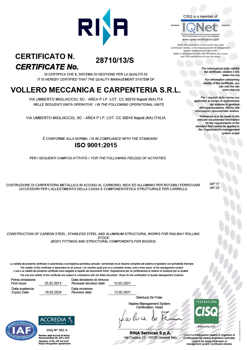 Dal 2002 la ditta Vollero opera in assicurazione qualità secondo lo schema previsto dalla norma ISO 9001:2008.
