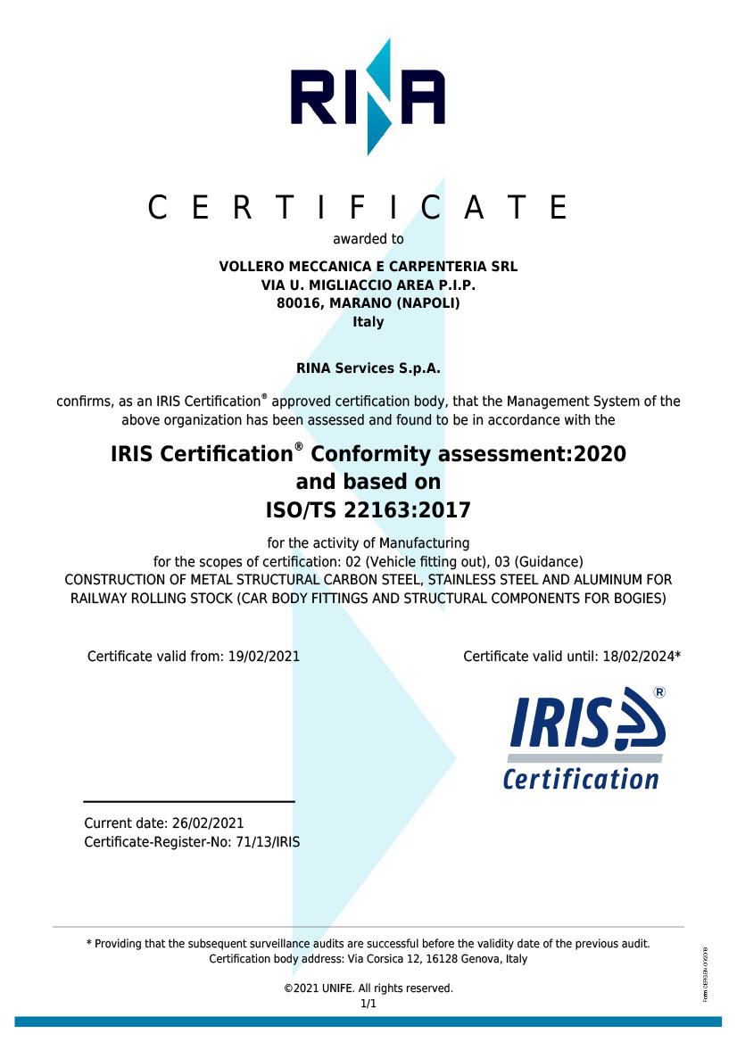 Inoltre, la ditta Vollero ha in fase di implementazione un Sistema di Gestione Competenze in conformità alla COCS 30/DT di Trenitalia per attività di manutenzione su organi di sicurezza del materiale rotabile.